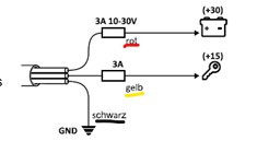 | Die OBU bleibt ständig an, unabhängig von der Zündung. | Das rote und gelbe OBU-Kabel wurden beide an Kl. 30 (Dauerplus) angeschlossen. | Gelbes Kabel mit Klemme 15 verbinden. |