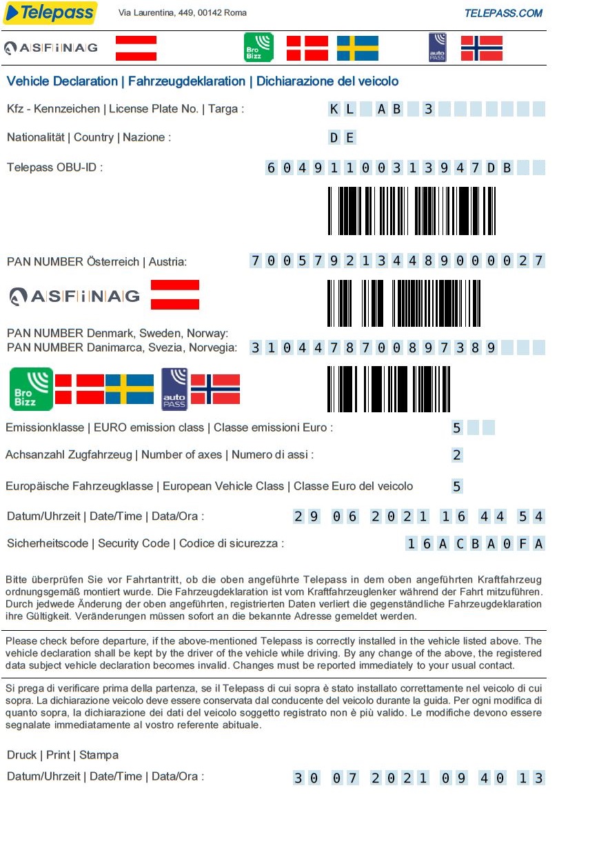 Im Fahrzeug muss die Fahrzeugdeklaration mit fahrzeugbezogenen Daten für Österreich und Skandinavien (Dänemark, Norwegen und Schweden) mitgeführt werden. Diese erhalten Sie bei einer Bestellung für diese Länder automatisch mit dem Benutzerhandbuch und der Mautbox und bei der neuen SVG fleXboxEUROPA Modell K1 kann die Fahrzeugdeklaration zusätzlich über die SVG Driver App heruntergeladen werden. Die Angaben auf der Fahrzeugdeklaration sollten überprüft und das Dokument anschließend stets im Fahrzeug mitgeführt werden.