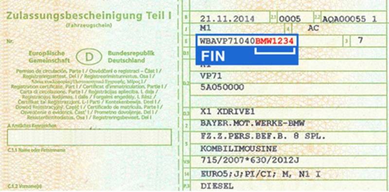 Die FIN ist die Fahrzeug-Identifizierungsnummer. Diese entnehmen Sie dem Fahrzeugschein unter dem Buchstaben ‚E‘. (siehe auch Abb. unten) Das Feld F.3 dagegen ist im Fahrzeugschein im darunter stehenden Freitext zu finden mit dem Text: ‚ZUL.ZUGGES.-GEW.‘ und hat meist die Größen: 40.000, 44.000 oder 54.000. Sollte dieses Gewicht nicht im Freitext des Fahrzeugscheines zu finden sein, dann im Hersteller-Datenblatt. Falls es dort nicht vorhanden ist, sollte der Kunde beim Hersteller nachfragen.