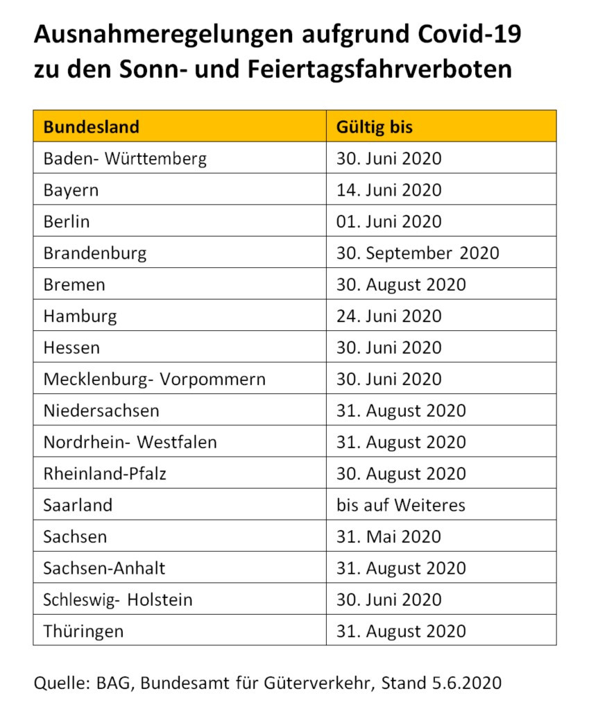 Aber Achtung, in Berlin und Sachsen gelten bereits seit Anfang Juni wieder die gewohnten Sonn- und Feiertagsfahrverbote, in Bayern werden sie ab dem 15. Juni und in weiteren Bundesländern ab Juli wieder eingeführt.